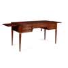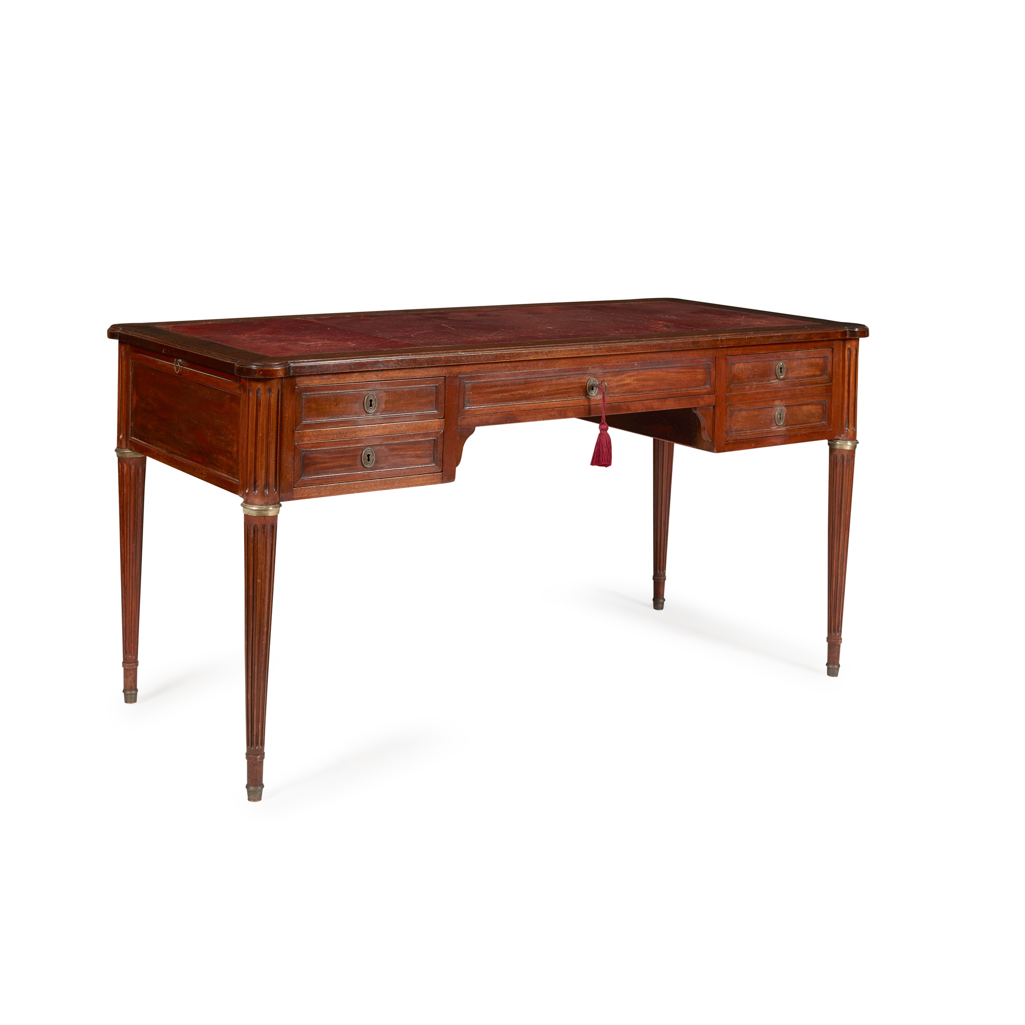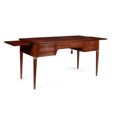 in the Louis XVI style, the top with a red leather writing surface and outset corners, with two slide extensions to both ends, above a central frieze drawer, flanked by a deep drawer and two short drawers, raised on tapered fluted legs