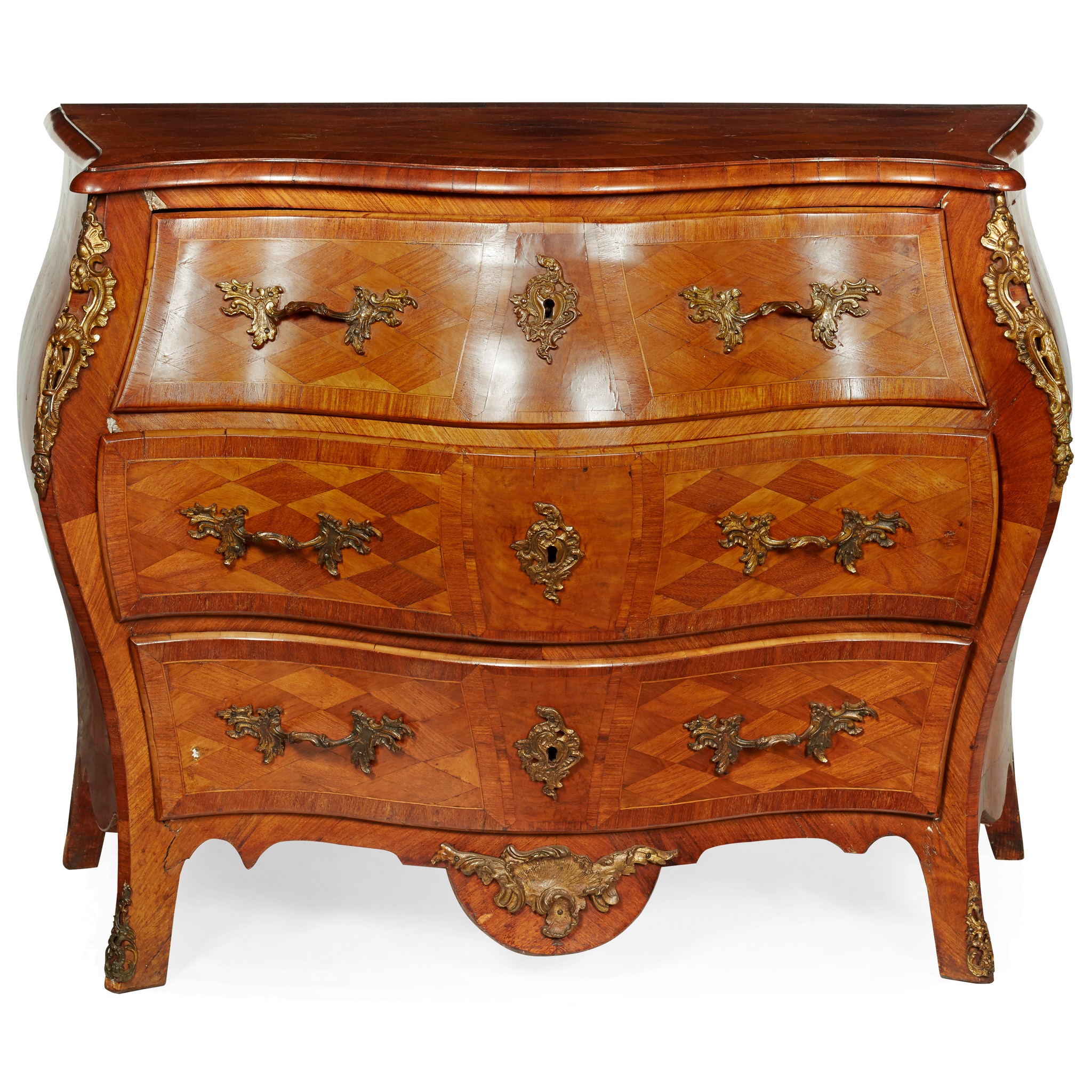the serpentine top over a bombé body with three long drawers with diamond parquetry, over a shaped apron and bracket feet, gilt metal mounts throughout