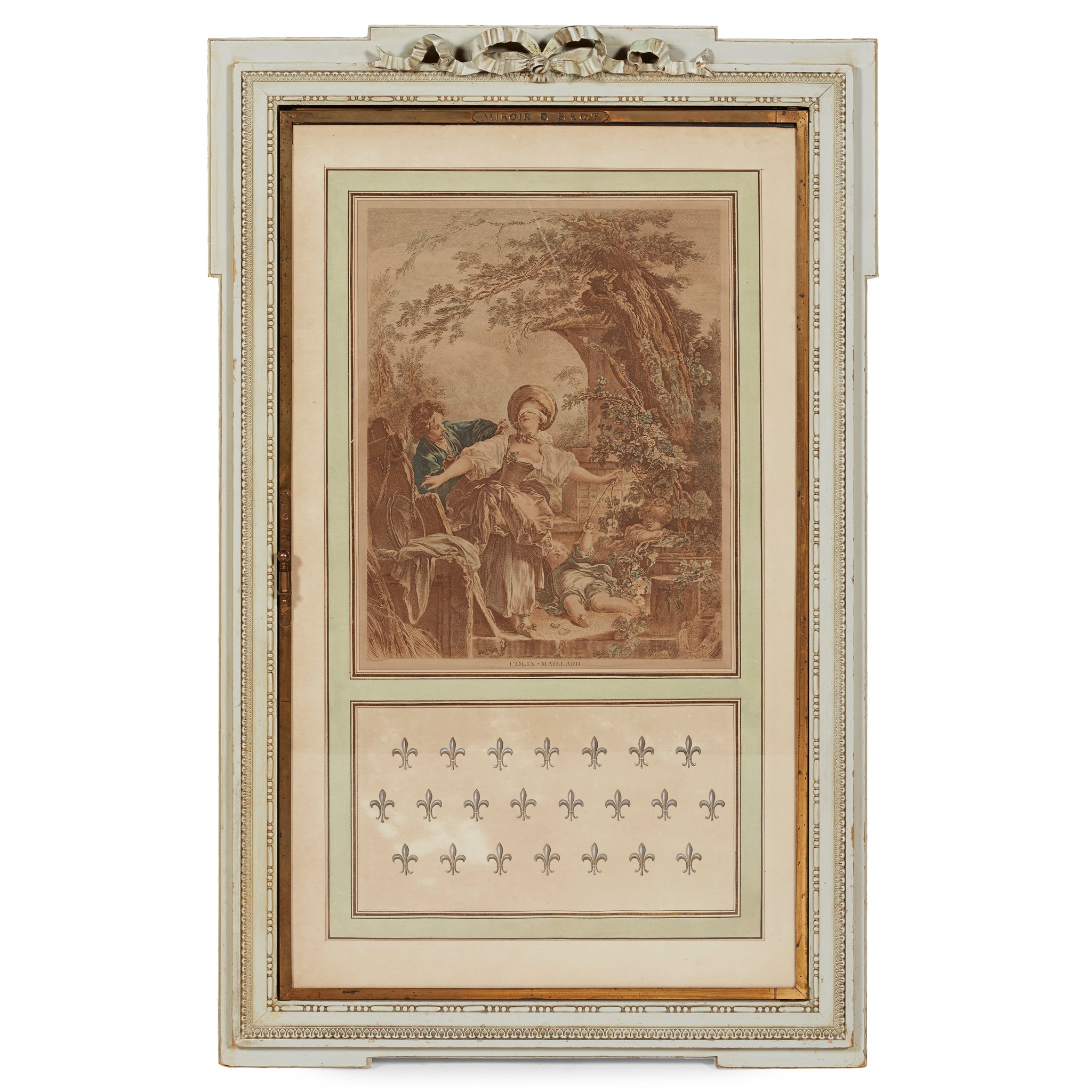 the triple hinged mirror plates in brass frames, stamped MIROIR BROT, the exterior with a coloured engraved print titled COLIN MAILLARD, in a grey painted frame