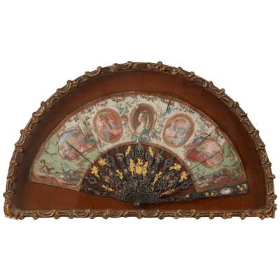with gilt embellished pierced tortoiseshell sticks, the leaf painted with an oval reserve portrait of a lady flanked by further reserves with classical scenes and fêtes galante, the guard with a portrait of a young man, mounted in a shadow-box frame with rococo mouldings