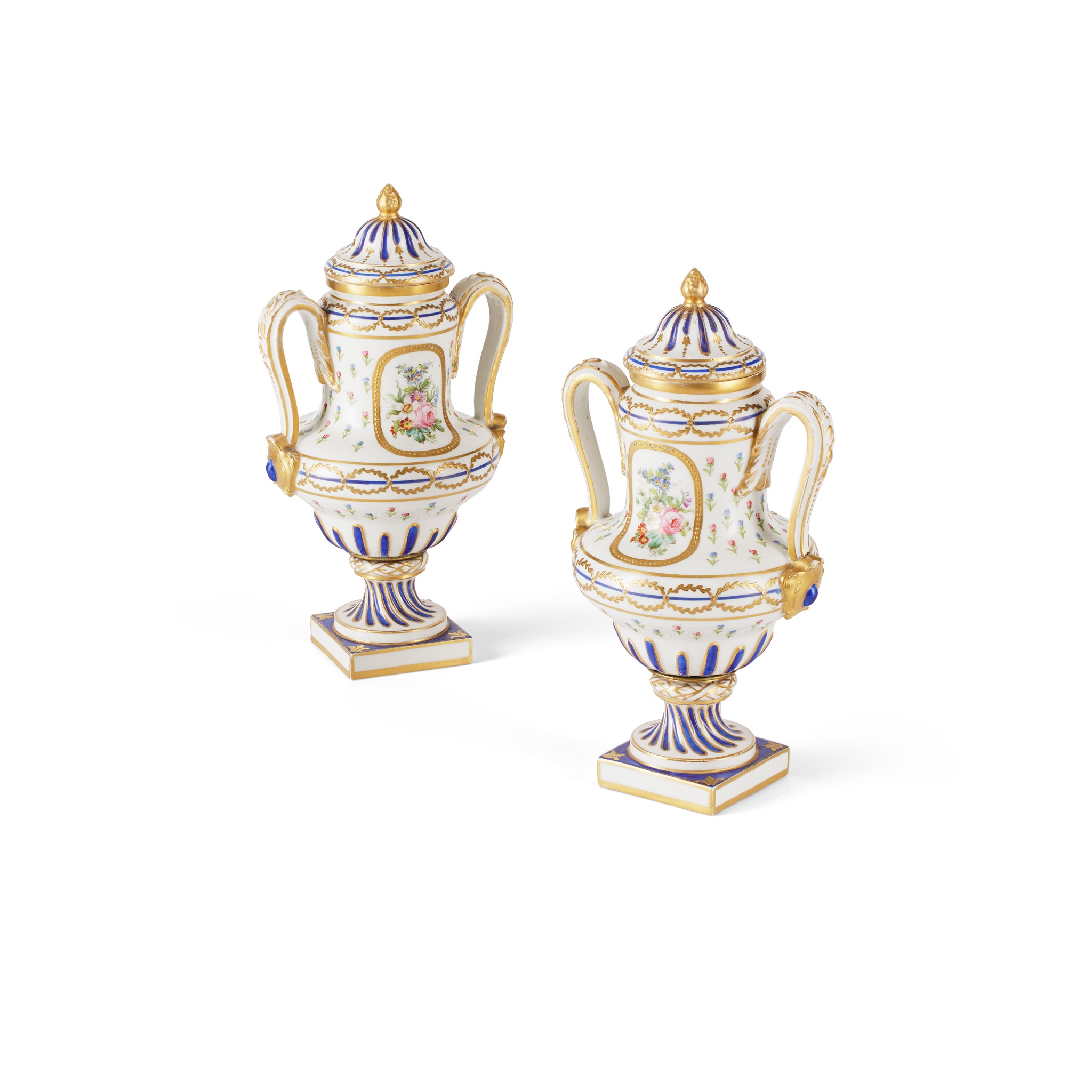 PAIR OF SÈVRES STYLE URNS AND COVERS