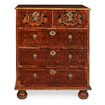 WILLIAM AND MARY WALNUT OYSTER VENEERED AND MARQUETRY CHEST OF DRAWERS