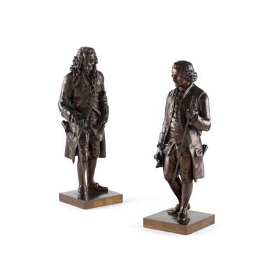 dark brown patina, after the models by Jean-Claude Rosset, called Rosset Pere (1706-1786), realistically modelled wearing frock coats with hats tucked under their arms, each with a walking stick
