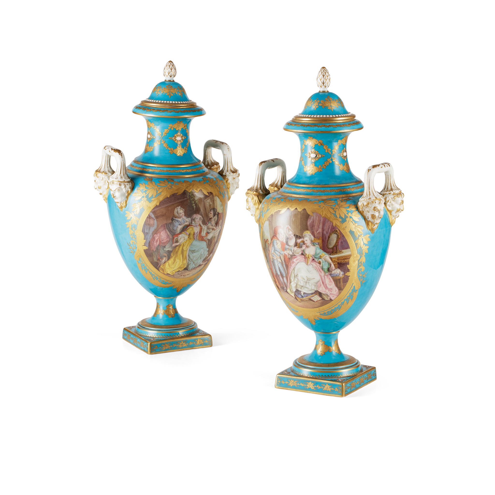 PAIR OF LARGE SÈVRES STYLE URNS AND COVERS