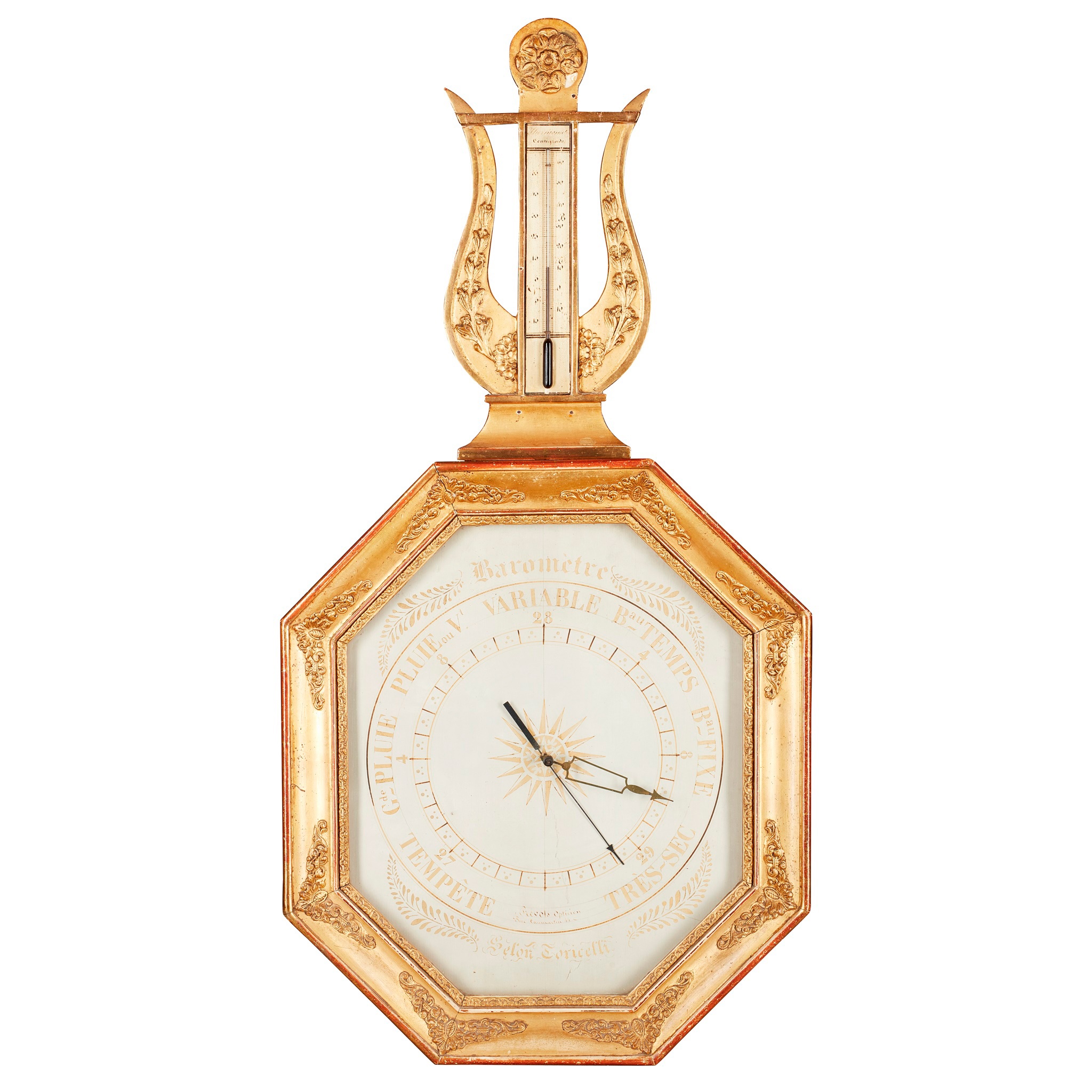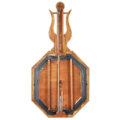 the octagonal barometer dial in a gilt frame surmounted by a lyre finial enclosing a thermometer, signed on the dial