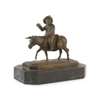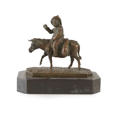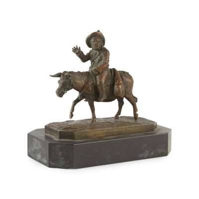 bronze, medium brown patina, modelled seated on a donkey waving his arm, on a naturalistic rectangular base with canted corners and signature, on a black marble plinth
