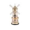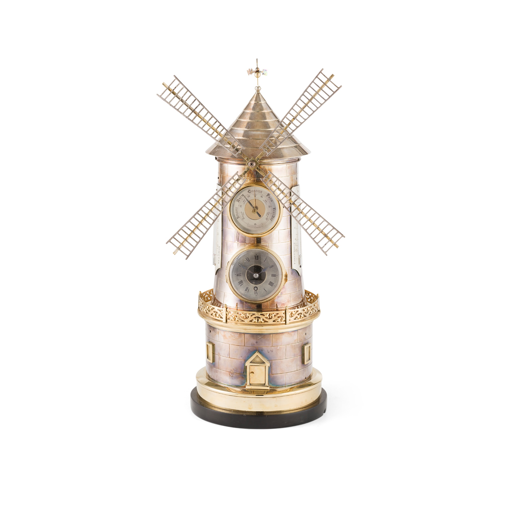 the silvered brass and brass case in the form of a windmill with automata action to the sails and weathervane, with a Roman numeral dial, barometer dial and twin thermometer scales, on a circular black slate base