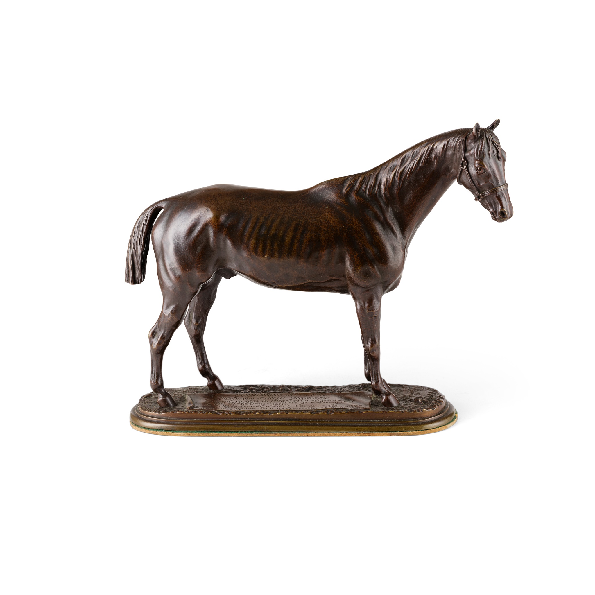 bronze, medium brown patina, modelled standing four square on a naturalistic ground, inscribed "Gladiateur né en 1862. Par Monarque et Miss Gladiator. Gagnant en 1864 du Clearwell à Newmarket, en 1865 des 2000 guinées du Derby d'Epsom, du Grand Prix de Paris. Appartenant à M. le comte de Lagrange. Entrainé par M. Thom. Jennings. Monté par H. Grimshaw", signed to base