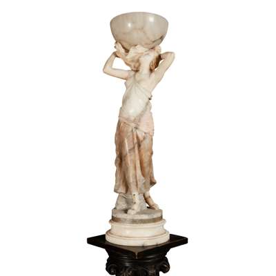 comprising a carved figure of a nereid holding a shell and basin on her shoulder, on an associated ebonised carved wood column