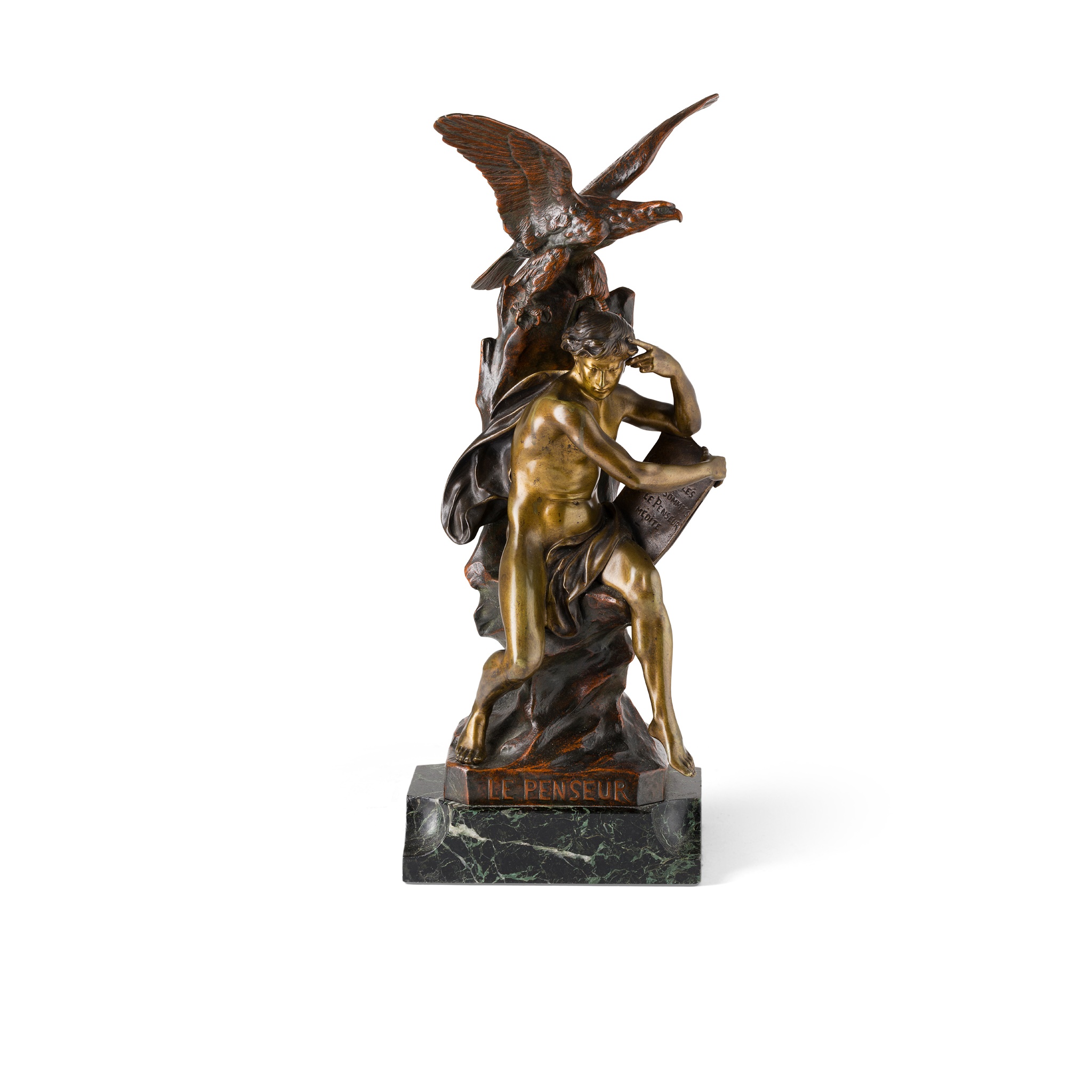 bronze, red-brown and gold-brown patinas, titled and signed on the base, mounted on a green marble shaped plinth