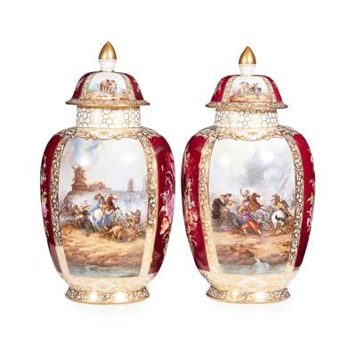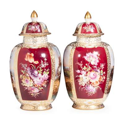 PAIR OF HELENE WOLFSOHN LARGE PORCELAIN COVERED VASES