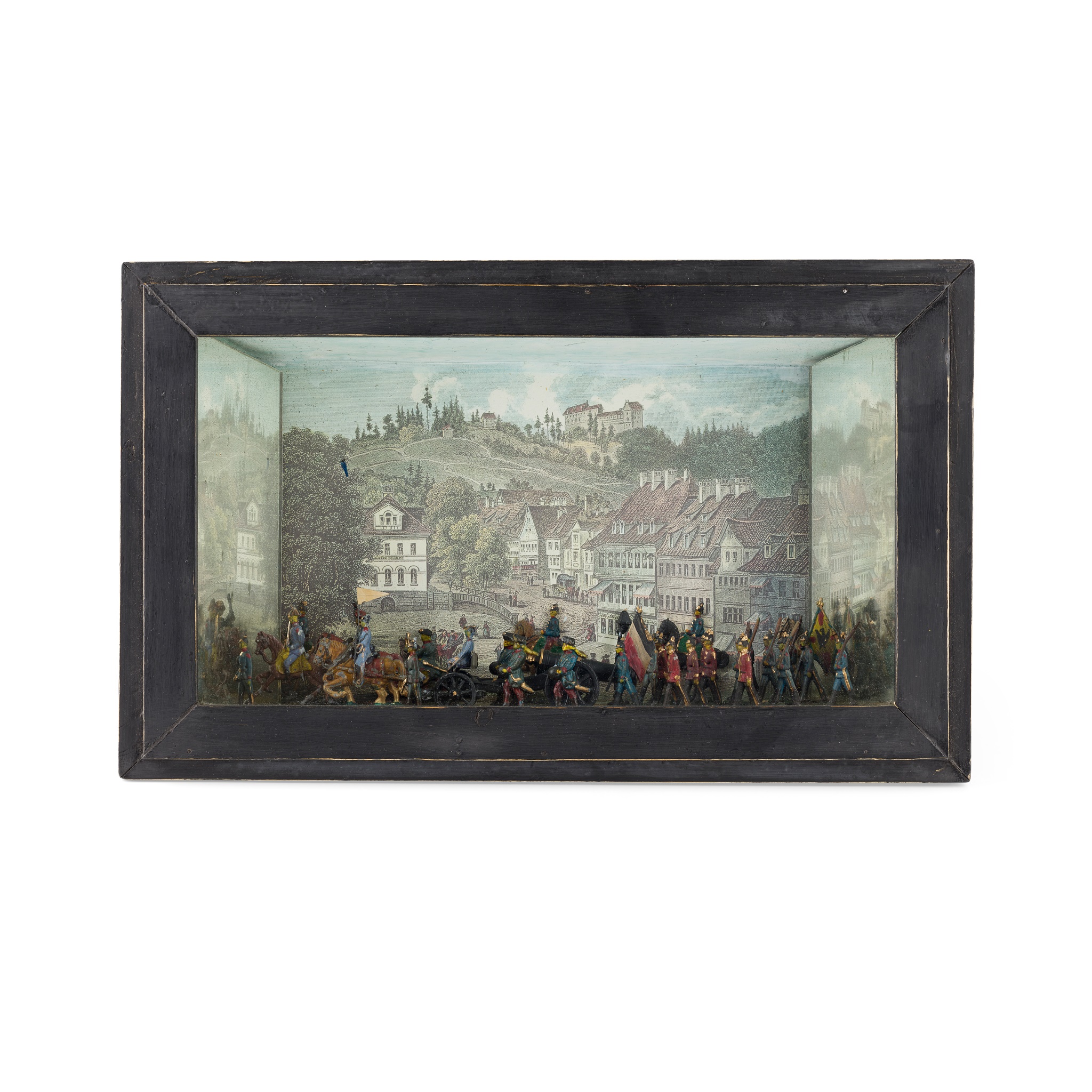 depicting a military procession of a large cannon with painted pewter figures against a coloured lithograhic town scene, the sides with mirror panels, stamped on the reverse 'ZINNBILD KAISEREICHES MILITÄR VITRINE'