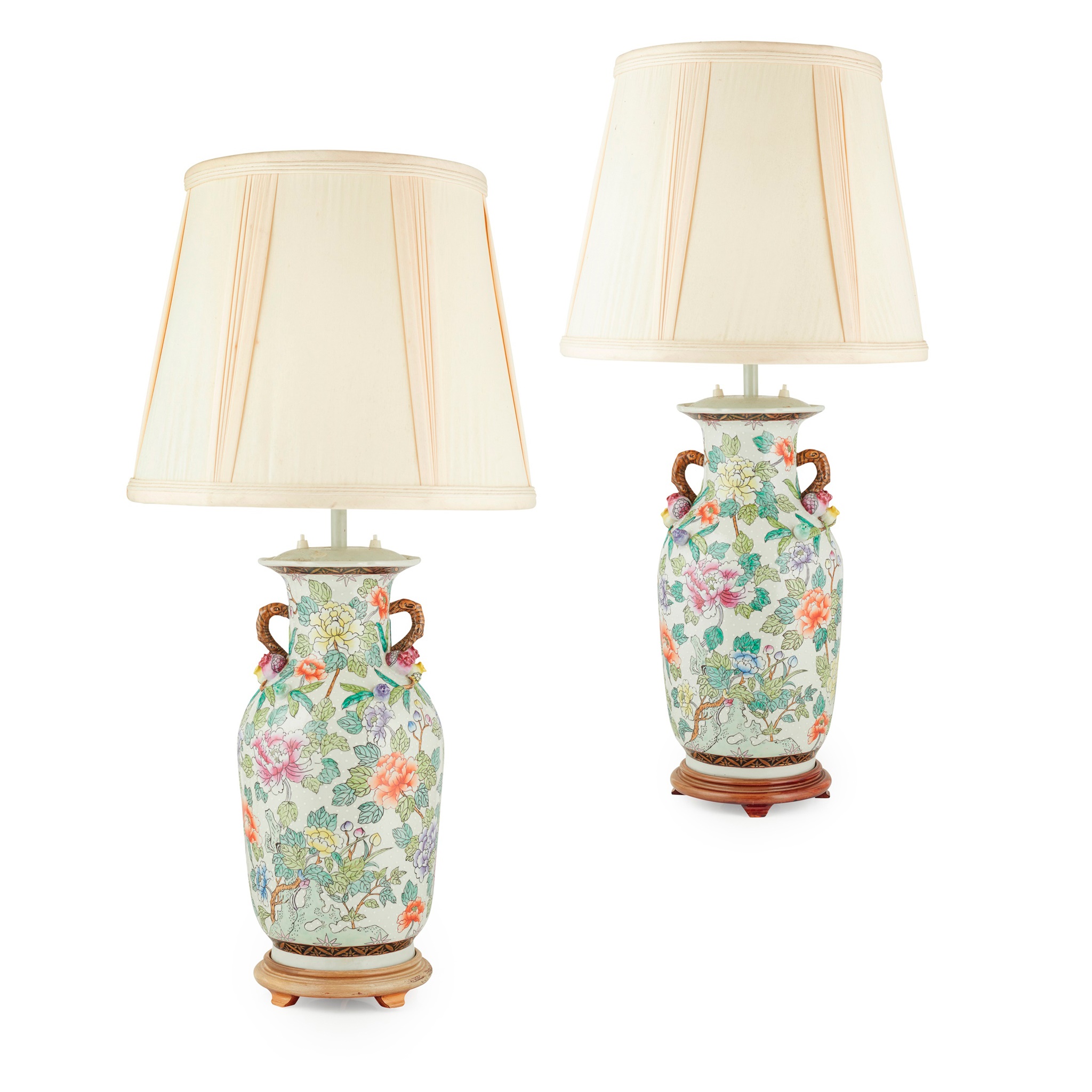the baluster bodies decorated with peonies, applied pomegranates, and naturalistic 'branch' handles, drilled through the base and mounted as lamps, with ecru silk shades