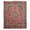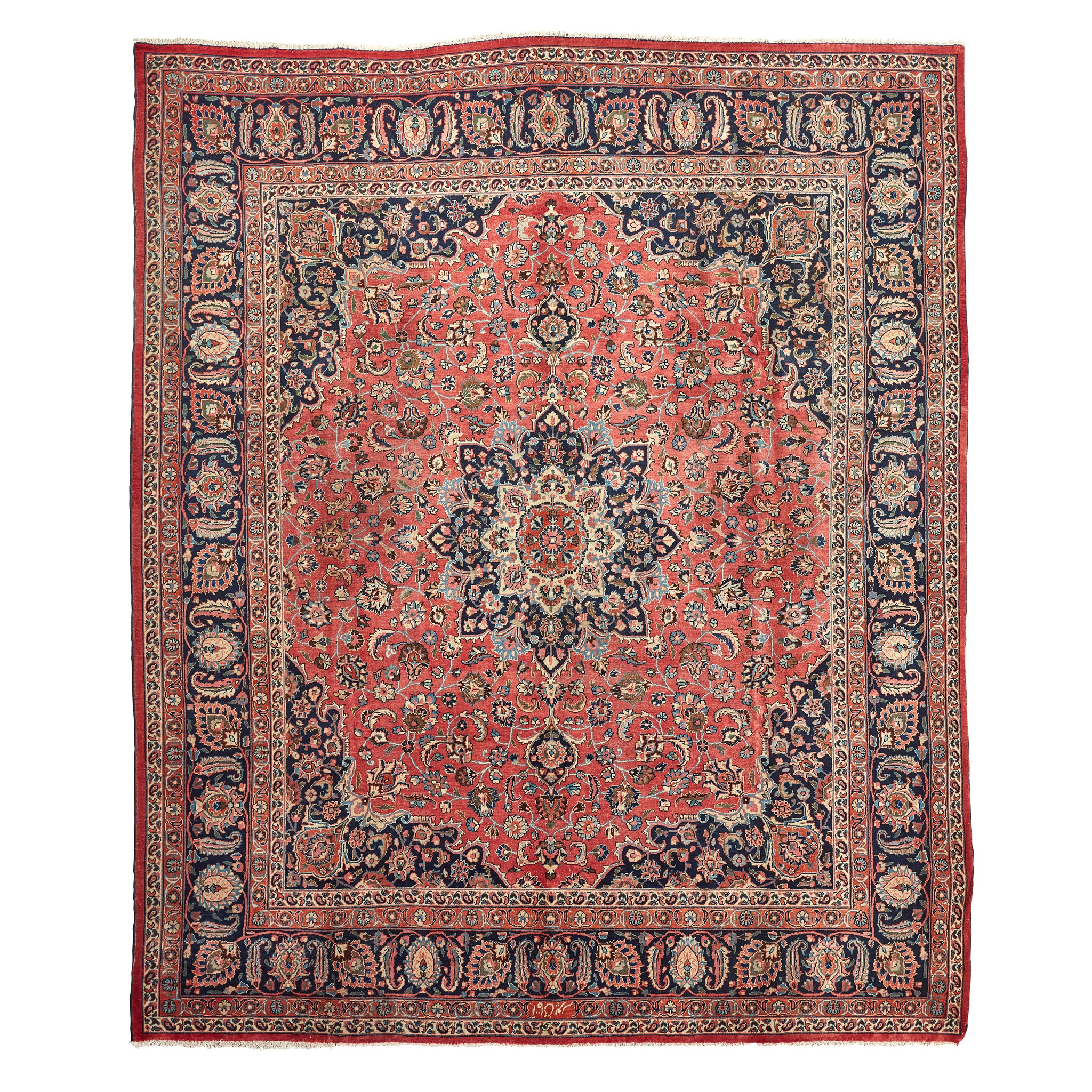 the red field with indigo and camel medallion, indigo spandrels, within indigo palmette and leafy vine border, signature to one end