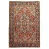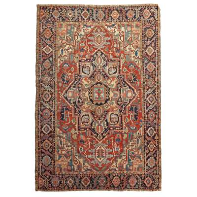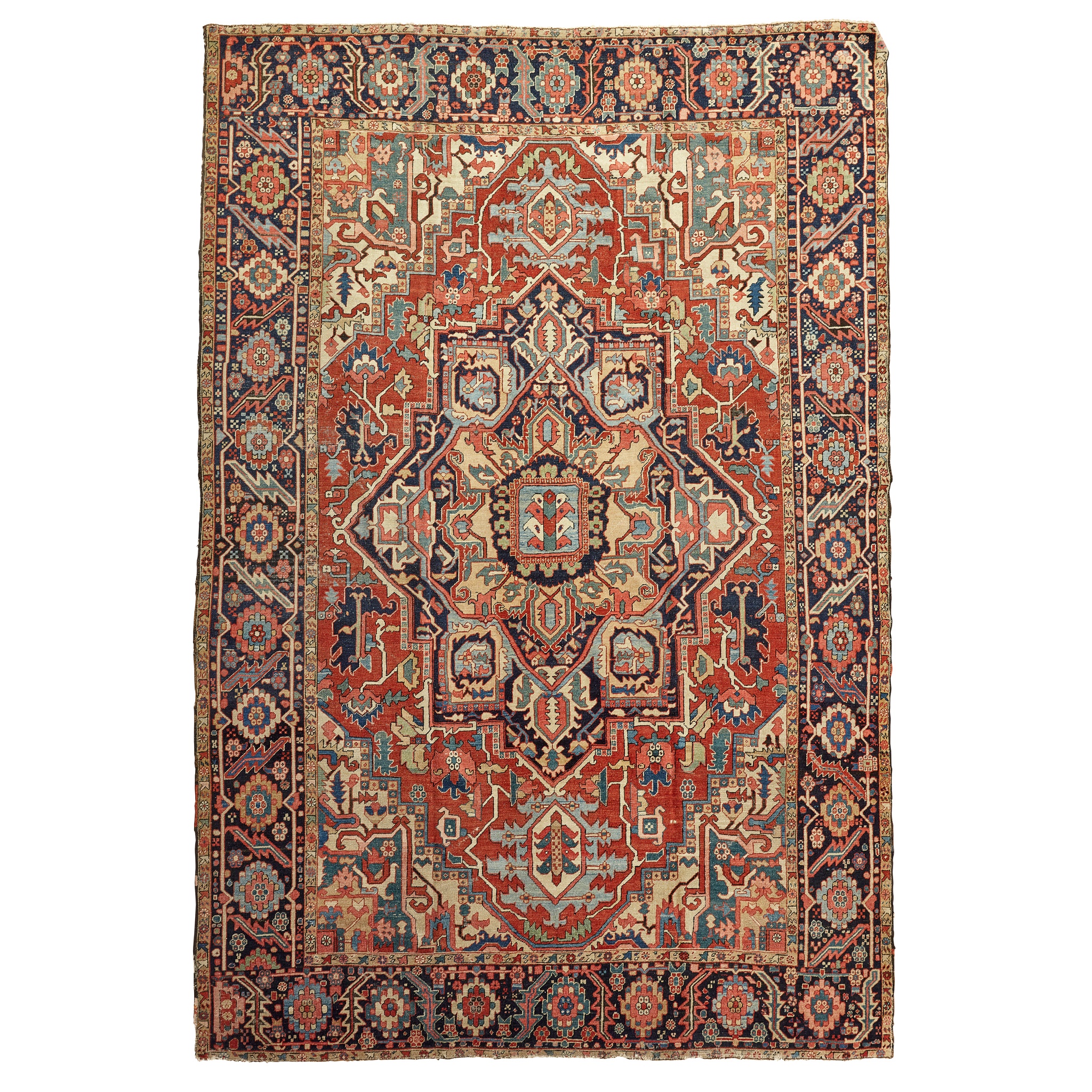 the red field with indigo and camel star medallion, ivory, turquoise and camel spandrels, within indigo rosette and leafy vine border