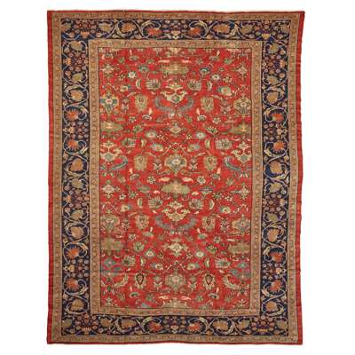 the red field with allover palmette foliate vine pattern, within indigo palmette and vine border