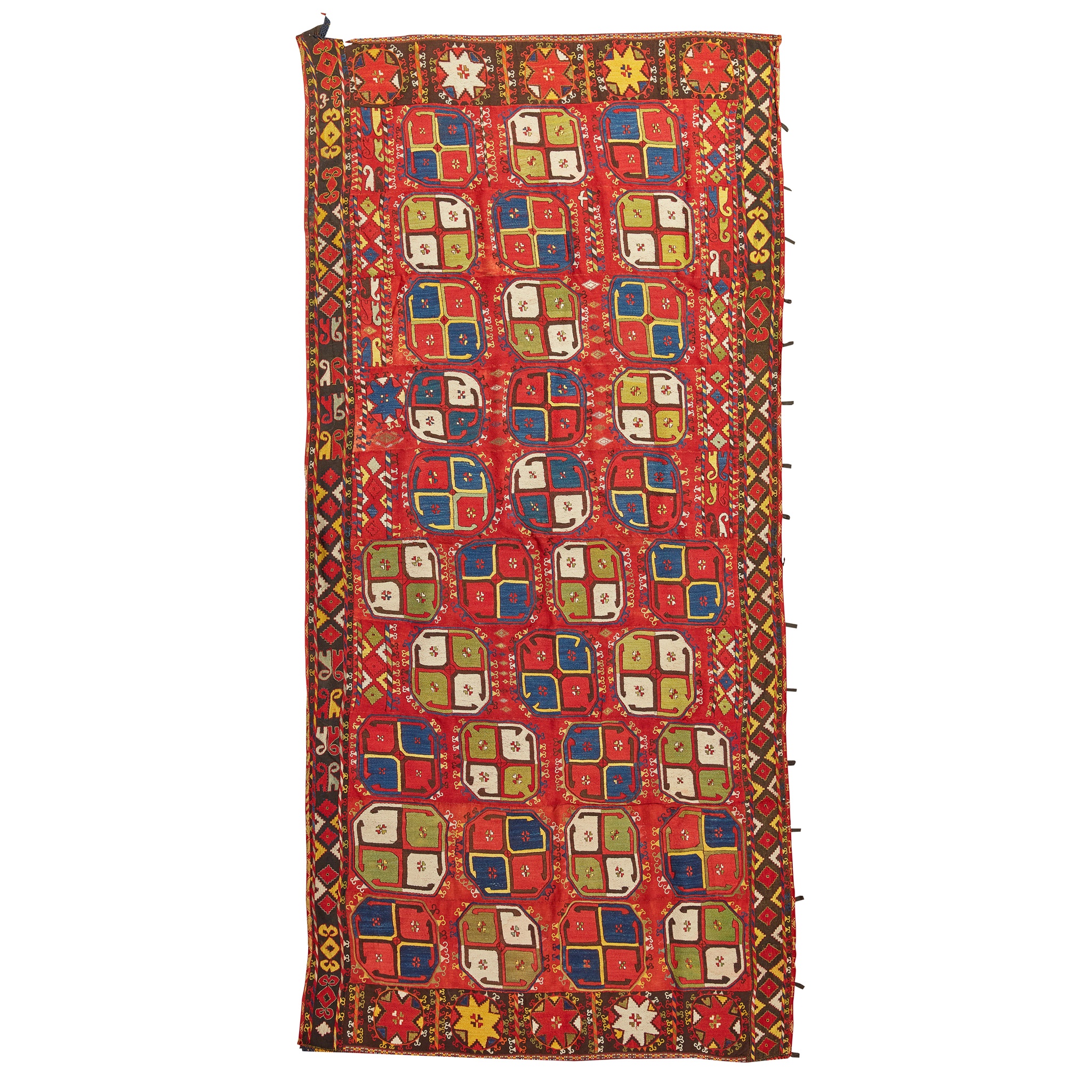 the red field woven in sections with allover gul pattern, within brown geometric border and lattice fringe ends
