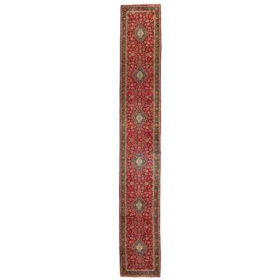 the red field with six indigo and ivory cusped medallions, within indigo palmette and arabesque vine border