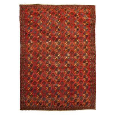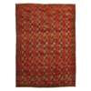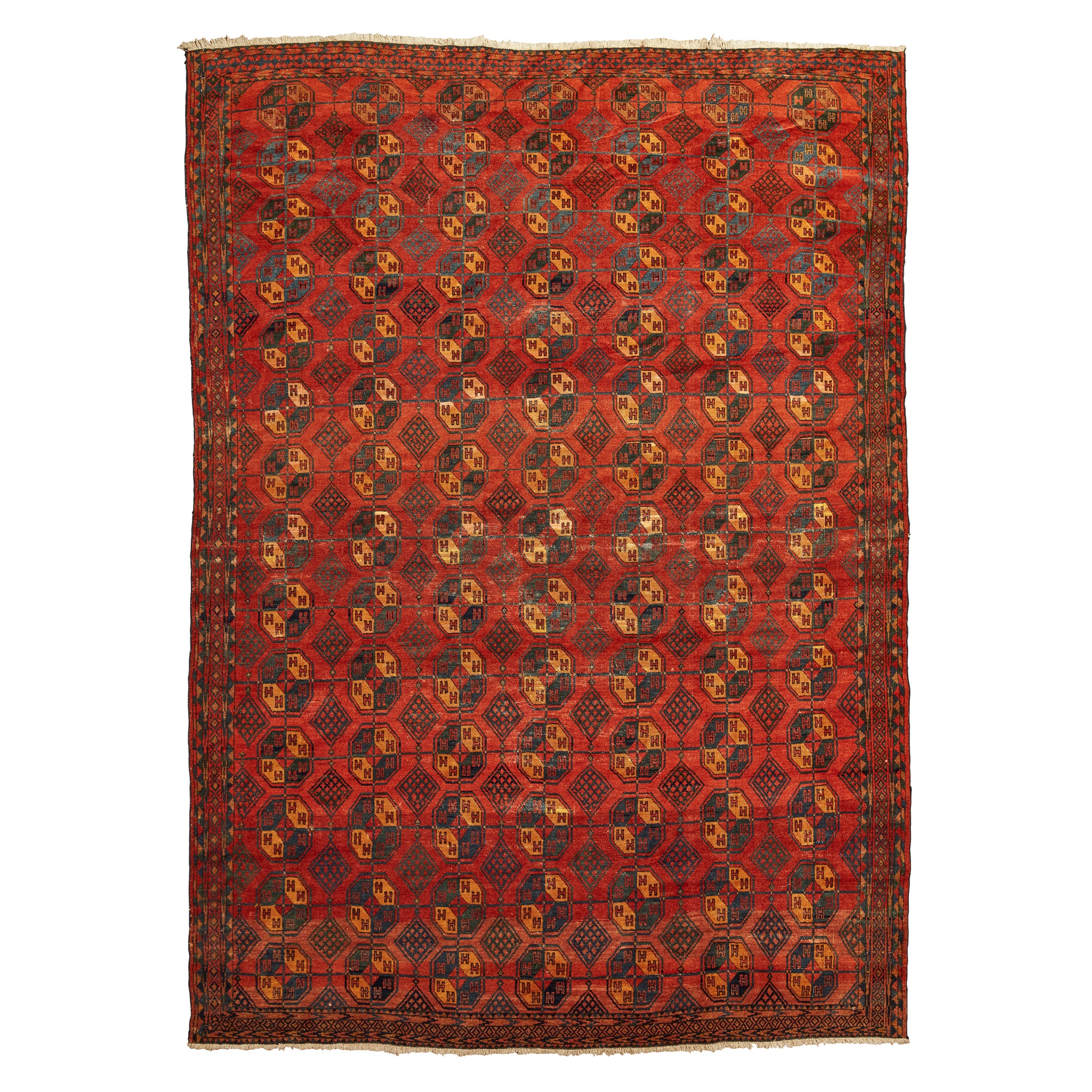 the red field with allover gul lattice pattern, within narrow indigo and red lozenge border