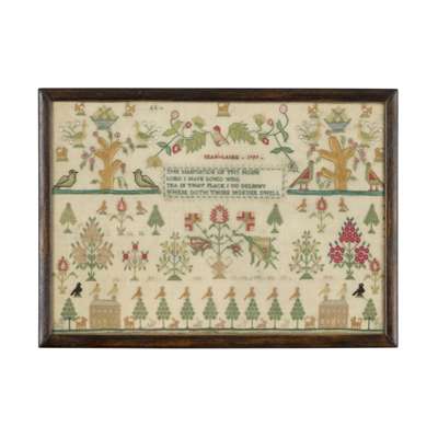 the first depicting Adam and Eve in the garden of Eden, further embellished with putto, flowering plants, keys, alphabet and number series, etc, bearing the initials '?MK SDM' and dated '1782'; the second named and dated 'Jean Laing, 1797', with the verse 'The habitation of thy house/Lord I have loved well/Yea in that place I do delight/Where doth thine honour dwell', worked in coloured threads with two houses, trees, flowers and foliage, etc.