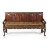 the back with five arched panels, above a long seat with squab cushion and open arms, above a shaped seat rail and raised on cabriole legs joined by side stretchers; the cushion covered in olive green plush with gold fringe trimming