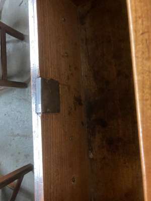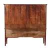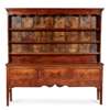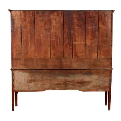 the moulded cornice above a shaped frieze, over three shelves and an enclosed back; the base with a configuration of five short drawers with a shaped apron, raised on square legs with corner brackets