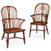 with pierced splats above shaped seats and U shaped arms, on turned legs joined by crinoline stretchers; one of ash and elm, the other of yew and elm
