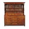 the moulded cornice with pendant finials above an enclosed back with two shelves and six short drawers, the base with four central drawers flanked by short drawers and arch panel cupboard doors, raised on stile feet