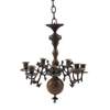 with a central knopped baluster stem issuing seven scrolled candle arms with urn candle nozzles and drip trays