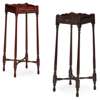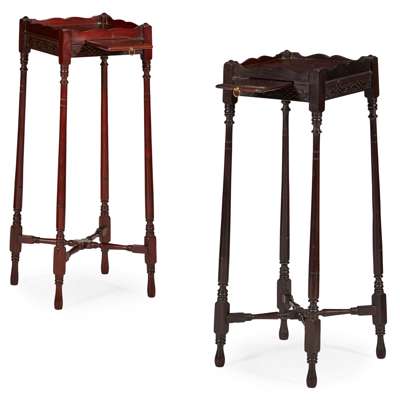 the square tops with wavy galleries above blind fret carved friezes with cup slides, raised on slender turned legs joined by turned cross stretchers