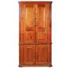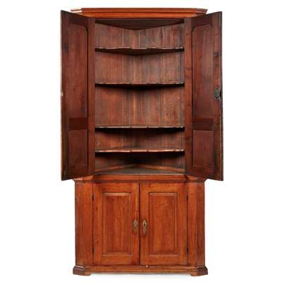 the moulded cornice above a pair of raised panel doors enclosing shaped shelves; the base with a pair of panel doors enclosing a further shelf, on a moulded plinth base