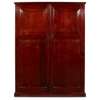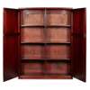 the moulded cornice above a pair of raised panel doors enclosing a compartmented interior, on a plinth base
