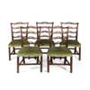 in the Chippendale style, with pierced ladder backs above wide stuff-over seats covered in green velvet, raised on chamfered straight legs joined by stretchers