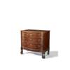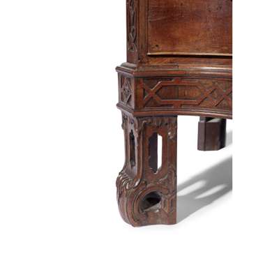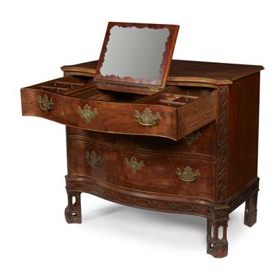 the serpentine top above a long drawer fitted with a baize writing surface, hinged mirror, and compartments, above two further long drawers flanked by blind fret carved angles, raised on a later blind fret carved base and pierced block feet