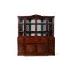 the arched cornice with fluting centred by a carved sunflower motif, over glazed doors marked at the corners with carved roundels and enclosing a pale blue painted interior with adjustable shelves; the base with a secretaire drawer inlaid with foliate scrolls and penwork, opening to reveal an interior fitted with pigeon holes, drawers and a red plush skiver, above a pair of panel doors opening to a sliding tray, flanked by banks of five graduated drawers, on a conforming plinth base