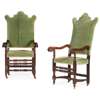 the high backs with shaped cresting above rectangular padded seats covered in green plush upholstery and flanked by scrolled open arms, on turned square legs with turned stretchers, with a combination of brass and ceramic castors