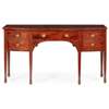 the plain top above a long drawer over an arch recess flanked by deep drawers, raised on square tapered legs with spade feet