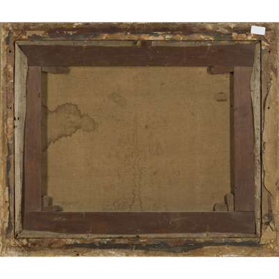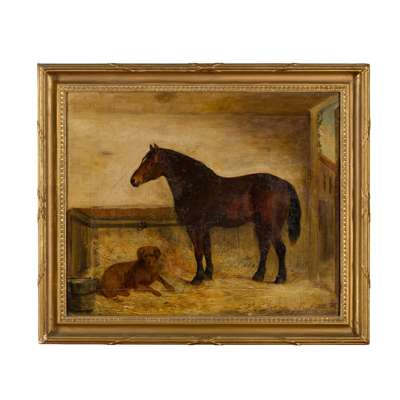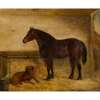 DARK BAY COB WITH A RETREIVER IN A STABLE