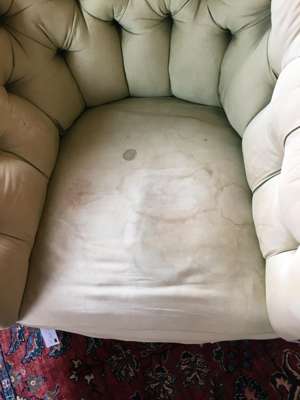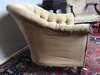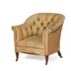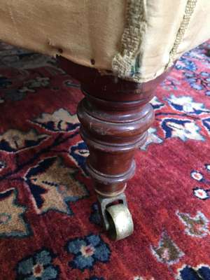 the arched button back, with outscrolled arms, raised on turned front legs, brass caps and castors
