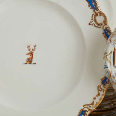each piece decorated with a crest showing a stag wearing a collar over a ropetwist band, the scalloped edged and scroll moulded borders highlighted with blue and gilt decoration, comprising: sixty six dinner plates, 25.7cm diam, twenty five bowls, 25.7cm diam, six oblong serving plates, 33.2cm long, two round footed comports with twin handles and domed cover, 30cm wide, unmarked, TOGETHER WITH similar matched Chamberlain's pieces including two smaller sauce tureens with covers, on stands, the tureens 18.2cm wide, and two larger round footed comports, one with a domed cover the other with cover lacking, with brown printed marks for Chamberlain H, 155 New Bond Street