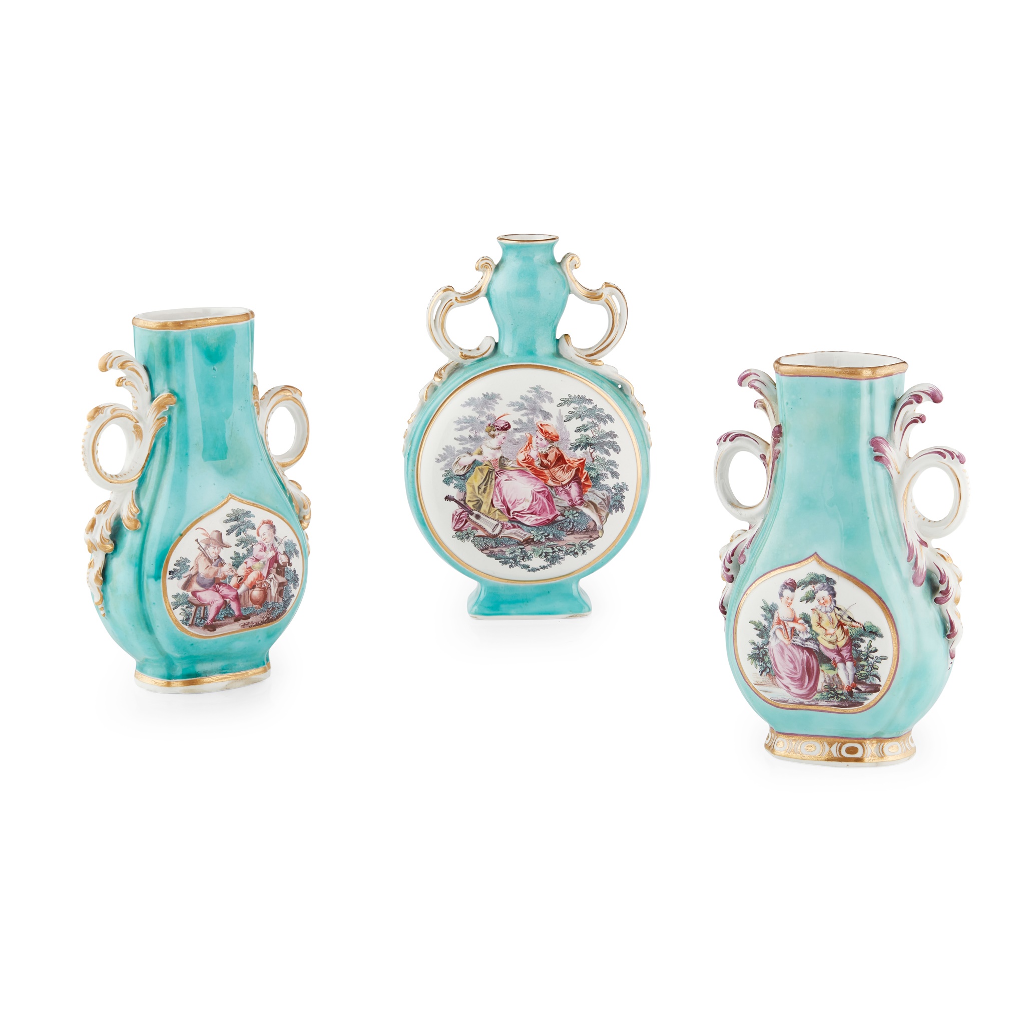 one of moon flask form, painted to one side with a Watteau inspired scene of courtship, and to the reverse with a floral bouquet, the scroll handles with gilt highlights, 19cm high, the other two of flattened pear shaped form with rococo scroll handles, one painted to both sides with scenes of courtship, the handles with gilt and puce decoration, the other painted to both sides with rustic scenes of men making music and of a couple smoking and drinking from a tankard, the scrolling handles with gilt highlights; all with gold anchor mark