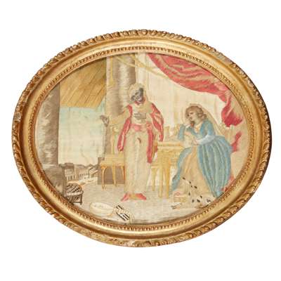 the oval panel worked in silk with painted faces, hands, and sky, depicting Desdemona in contemporary dress seated at a table, a dog at her feet, while Othello gestures through a pillared archway to the Grand Canal, in a giltwood frame