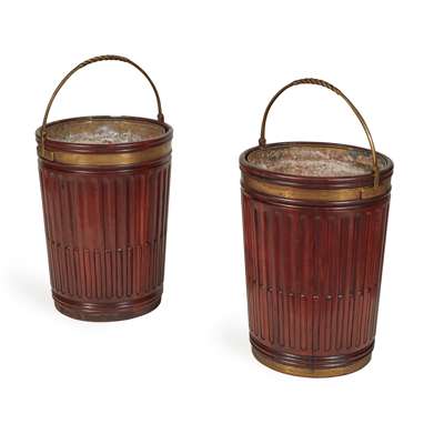 with brass bail handles and banding above stop-fluted tapered sides, with brass liners