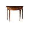 the crossbanded demi-lune fold-over top above a frieze outlined with stringing and marked with shell inlay, raised on moulded square tapered legs ending in brass caps and castors