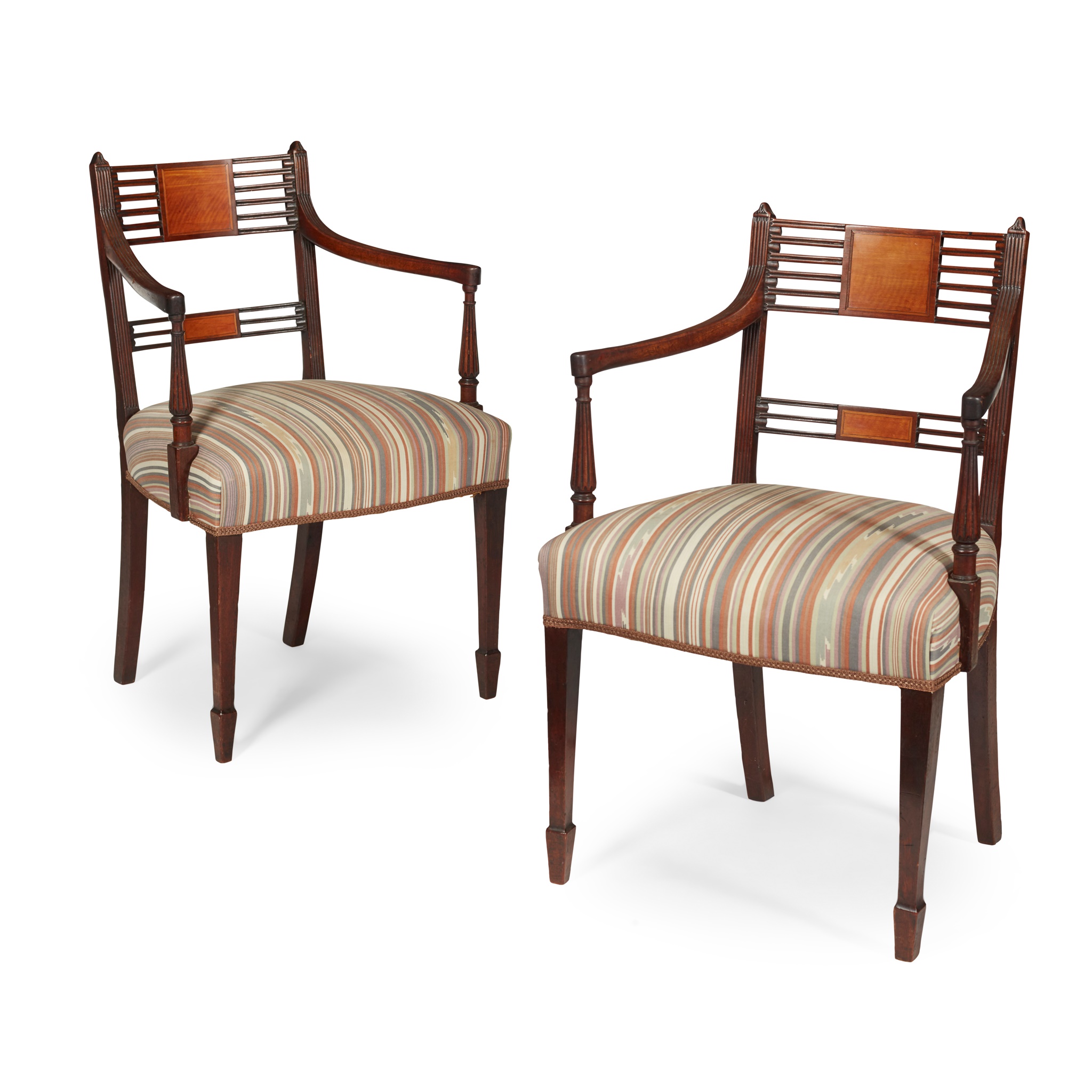 in the Sheraton style, the pierced bar backs with a central square panel, above wide stuffover seats flanked by downswept arms with fluted baluster supports, raised on square tapered legs ending in spade feet, covered in striped upholstery