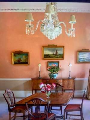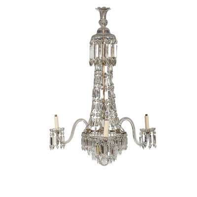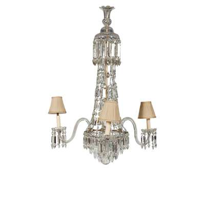 hung with prism swags and drops, with three scrolling candles arms with scalloped drip trays, above a tiered waterfall base, fitted for electricity