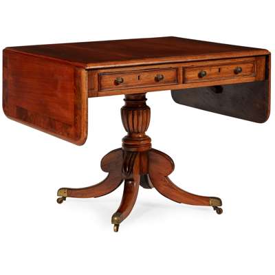 the rounded rectangular top with drop ends and banded inlay, over two frieze drawers, raised on a baluster turned reeded column with four scrolled sabre legs ending in brass caps and castors