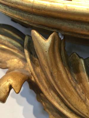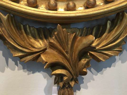the convex plate in a reeded ebonised slip and deep moulded frame with ball mounts surmounted by an eagle cresting flanked by dolphins, with acanthus pendant finial