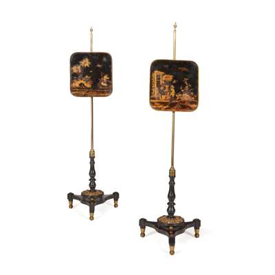 PAIR OF REGENCY LACQUER, EBONISED AND BRASS MOUNTED POLESCREENS