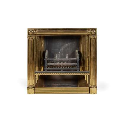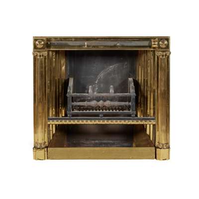 the surround with a fluted cross bar and flanking Ionic fluted columns enclosing an iron grate and ash pan